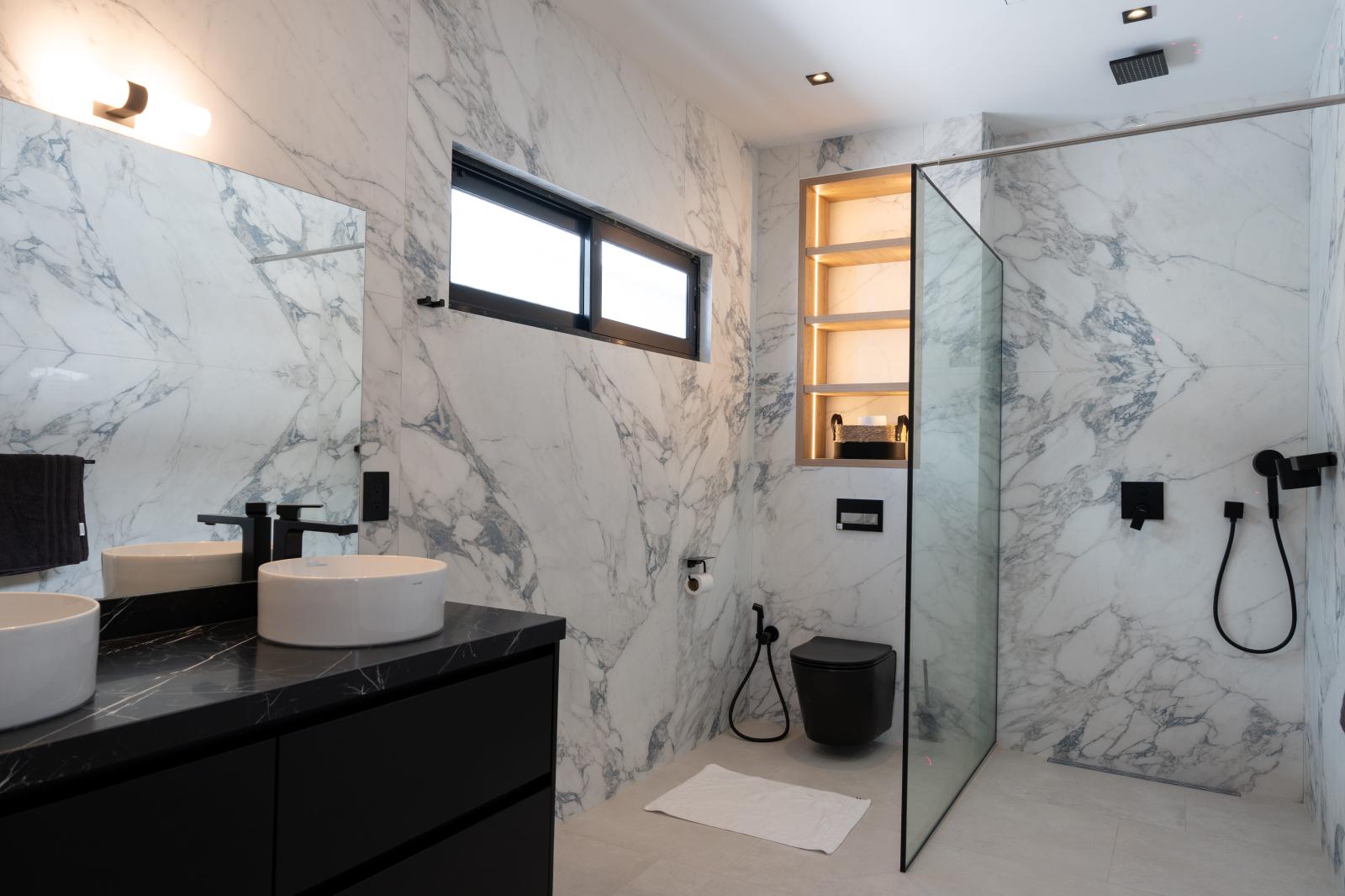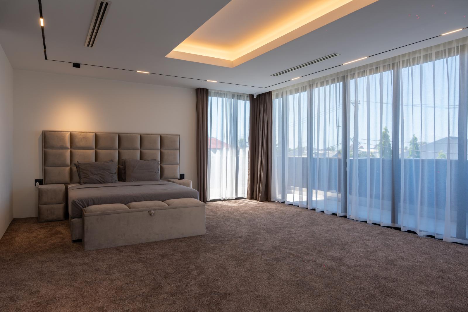 Each villa features three generously sized bedrooms, designed for rest and privacy, complemented by three and a half modern bathrooms finished with high-end materials and a minimalist aesthetic. The master suite offers a serene retreat, with direct access to the outdoors and views of the pool area.
