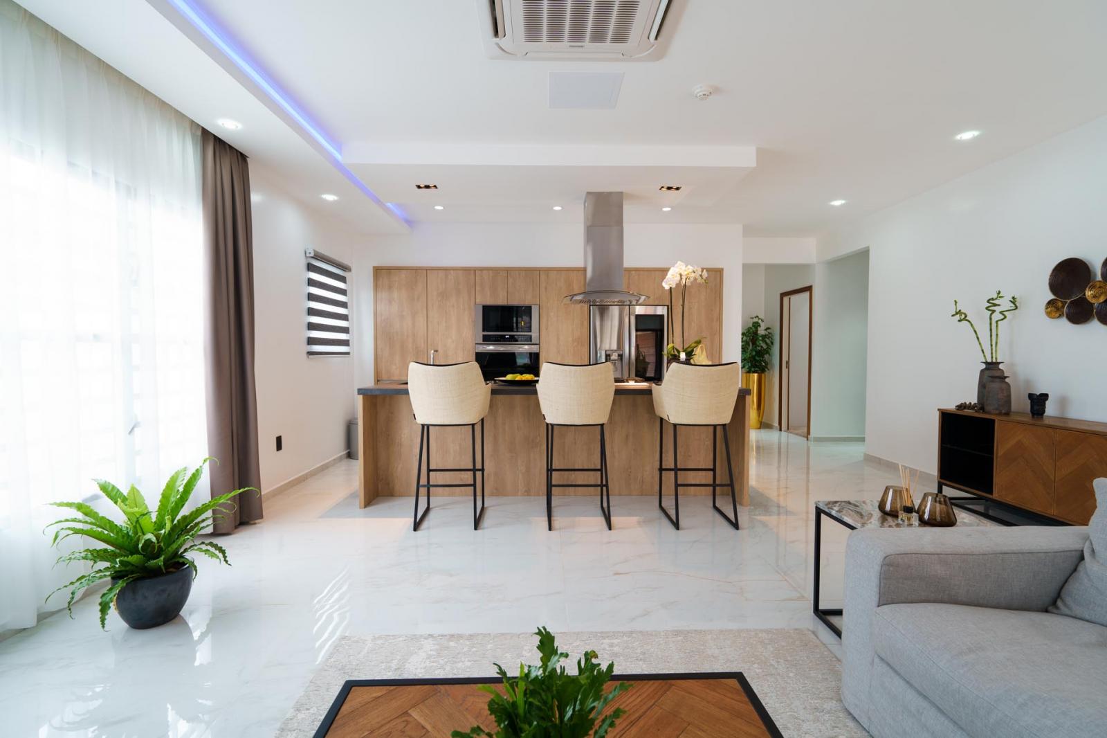 This beautiful fully air conditioned Arcton home with wooden details and a peaceful ambience located in Paramaribo Noord is fully furnished in style, ready for you to move in. The home has a natural but elegant look with a timeless vibe. Updated with the latest gadgets and appliances, this home offers three trendy bedrooms and two bathrooms detailed to perfection with Spanish tiles and stainless-steel shower and faucet. The open concept kitchen and living area gives this home a beautiful and spacious entrée with natural lighting. The kitchen is custom made with a full wooden look, has a large kitchen island, giving you the possibility to entertain your guests while cooking.