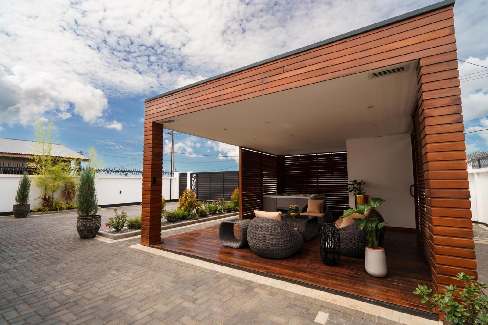 The home comes with its own washer and dryer room and has a secluded private seating area in its peaceful garden with a jacuzzi, complimented with a wooden shade structure. The garage is designed for two cars and has its own entrance to the house. Like all Arcton homes, this home comes with its own power generator and a full security home system.